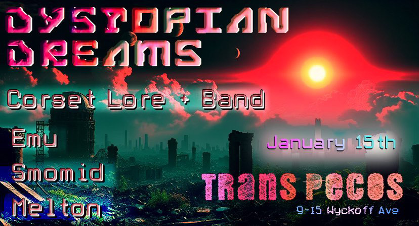 *INCOMING GIG* Dystopian Dreams organized by Smomid will take place next Wednesday, Jan 15 at Trans Pecos in Ridgewood. Another sick lineup featuring unusual audiovisual acts Melton, Emu and Smomid. For anyone who couldn’t make it out to my release show last Thursday at Main Drag, here’s another opp to catch me with Max Kutner on bass and Kevin Shea on drums! Would love to see you!