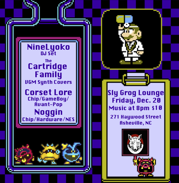 Hello Asheville! Playing at Sly Grog Lounge with a cool Chip / vgm / adjacent lineup including MAGfest community brethren: The Cartridge Family and Noggin! Come out to witness this cool confluence of video game – adjacent performance!